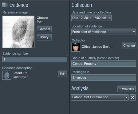 All evidence collected can be recorded in CrimePad. Easy-to-use drop down menus and areas for collection information make building a complete Evidence Log a simple task. You can also attach a reference image of each item of evidence to provide a visual image of what was collected. These images may be downloaded from your SLR or taken directly with the camera built into your iPad.